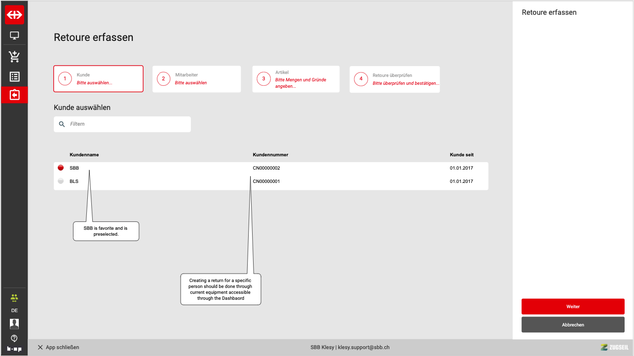 Return creation - customer selection